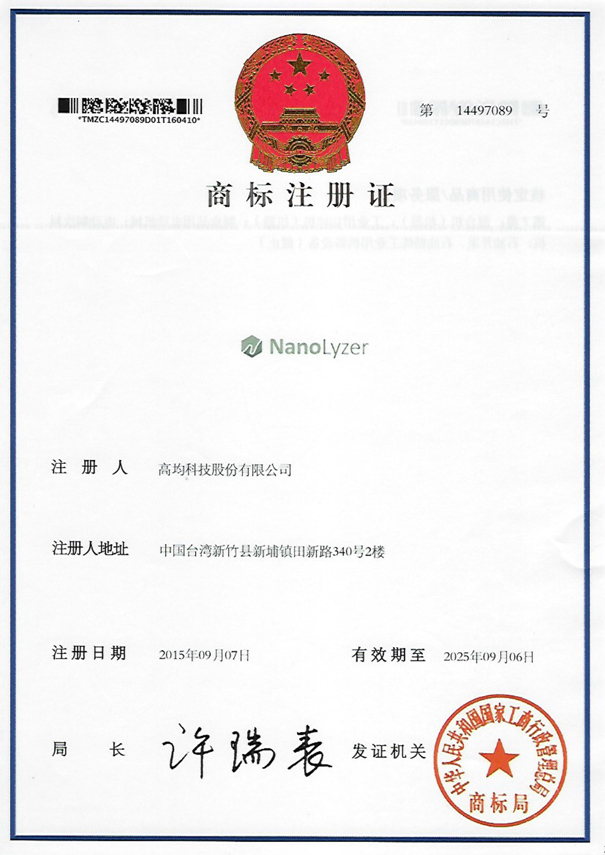 Trademark registration certificate
