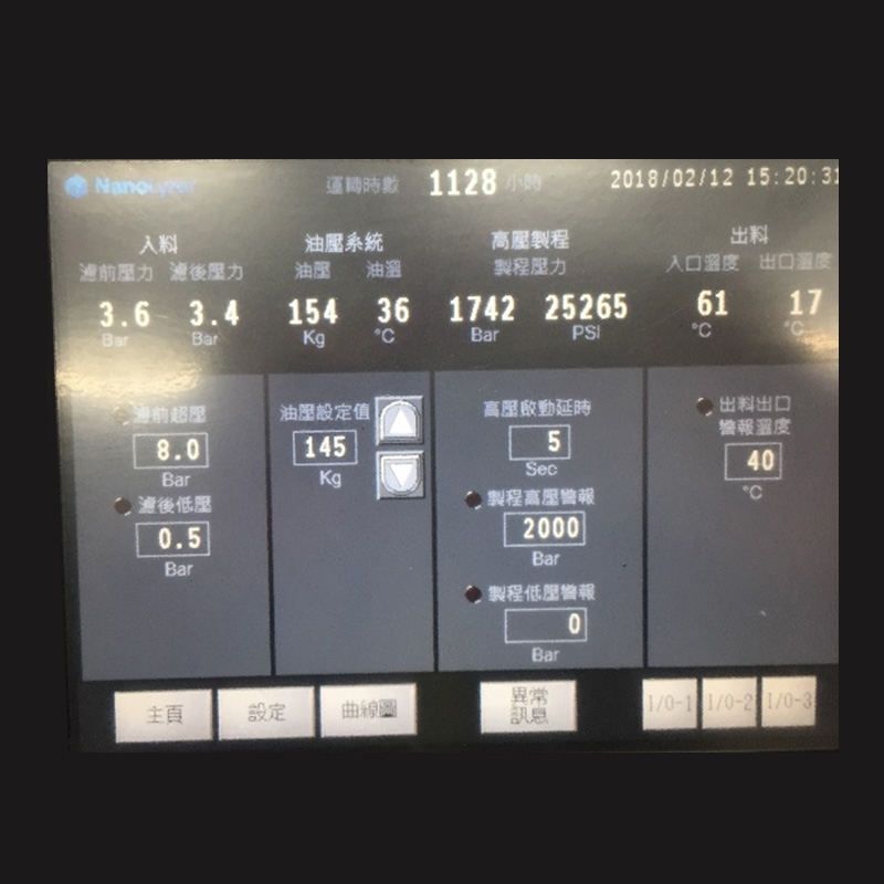 In the application field of NanoLyzers such as battery manufacturing, bio energy and carbon reduction industries, energy consumption is one of the key considerations of future advance processing. We successful supply energy-saving industrial production models to meet customer requirements. It equipped with Electric Servo Pump to replace conventional oil Hydraulic system, which successfully reduce 50% electrical consumption and achieved the same maximum pressure and flow rate.