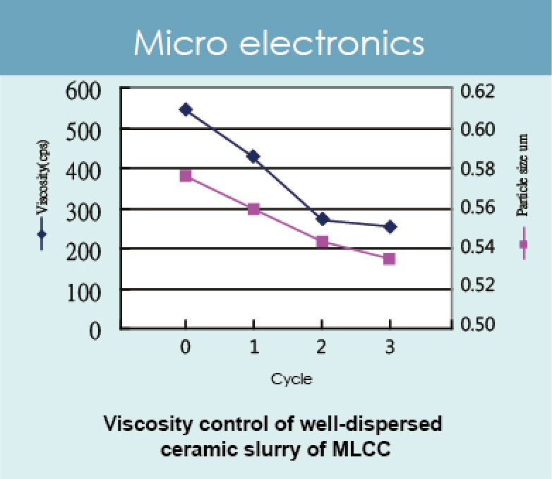 NanoLyzer's ultra-high shear force can be used to replace or enhance the mixing operation of stirrers and conventional homogenizers. Better dispersion results can be obtained under the same formulation of polymer solution. Take multi-layer ceramic capacitor (MLCC) as an example, its polymer binder usually mixed with different polymers which with different molecular weights, it can be observed that viscosity of binder solution significantly reduced by high pressure homogenization process ofNanoLyzers, meanwhile the residue of micro-gel particles can be reduced, conducive to preparation of ceramic powder paste (Slip) and thin film coating process, greatly improve the characteristics of the MLCC finished product.